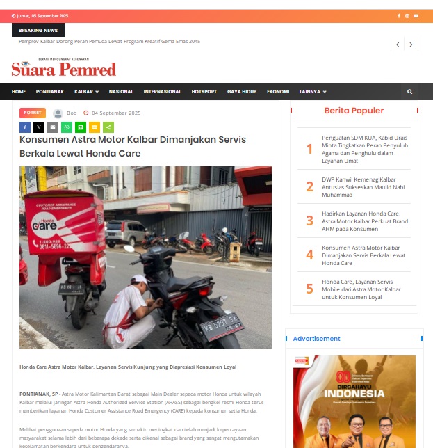Konsumen Astra Motor Kalbar Dimanjakan Servis Berkala Lewat Honda Care by masmul 4 September 2025 in Silahkan kunjungi https://www.suarapemredkalbar.com/read/potret/04092025/konsumen-astra-motor-kalbar-dimanjakan-servis-berkala-lewat-honda-care. You Might Like Regional Public Launching New ADV160 The SUV Pride Grand Launching New PCX 160 Truly Exceptional! Tetap hati-hati ya bro sist berkendara saat hujan.