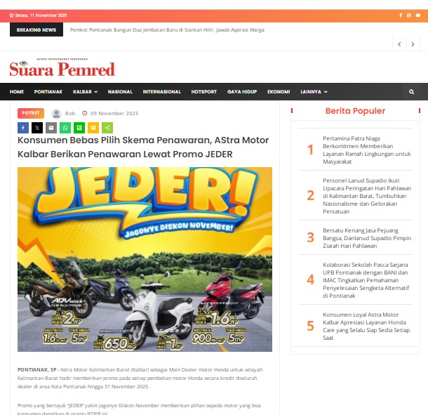 Konsumen Bebas Pilih Skema Penawaran, AStra Motor Kalbar Berikan Penawaran Lewat Promo JEDER by masmul 9 November 2025 in Silahkan kunjungi https://www.suarapemredkalbar.com/read/potret/09112025/konsumen-bebas-pilih-skema-penawaran-astra-motor-kalbar-berikan-penawaran-lewat-promo-jeder. You Might Like Regional Public Launching New ADV160 The SUV Pride Grand Launching New PCX 160 Truly Exceptional! Tetap hati-hati ya bro sist berkendara saat hujan.
