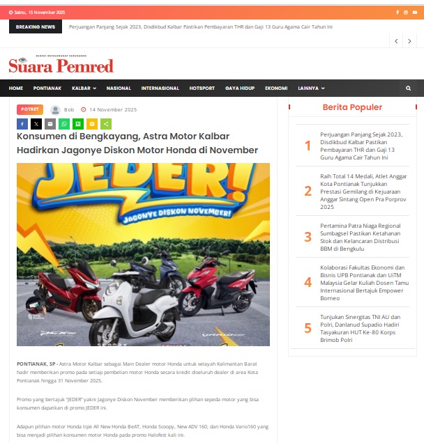 Konsumen di Bengkayang, Astra Motor Kalbar Hadirkan Jagonye Diskon Motor Honda di November by masmul 14 November 2025 in Silahkan kunjungi https://www.suarapemredkalbar.com/read/potret/14112025/konsumen-di-bengkayang-astra-motor-kalbar-hadirkan-jagonye-diskon-motor-honda-di-november. You Might Like Regional Public Launching New ADV160 The SUV Pride Grand Launching New PCX 160 Truly Exceptional! Tetap hati-hati ya bro sist berkendara saat hujan.