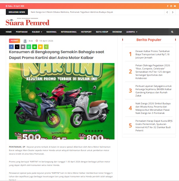 Konsumen di Bengkayang Semakin Bahagia saat Dapat Promo Kartini dari Astra Motor Kalbar by masmul 18 April 2026 in Silahkan kunjungi https://www.suarapemredkalbar.com/read/potret/18042026/konsumen-di-bengkayang-semakin-bahagia-saat-dapat-promo-kartini-dari-astra-motor-kalbar. You Might Like Regional Public Launching New ADV160 The SUV Pride Grand Launching New PCX 160 Truly Exceptional! Tetap hati-hati ya bro sist berkendara saat hujan.
