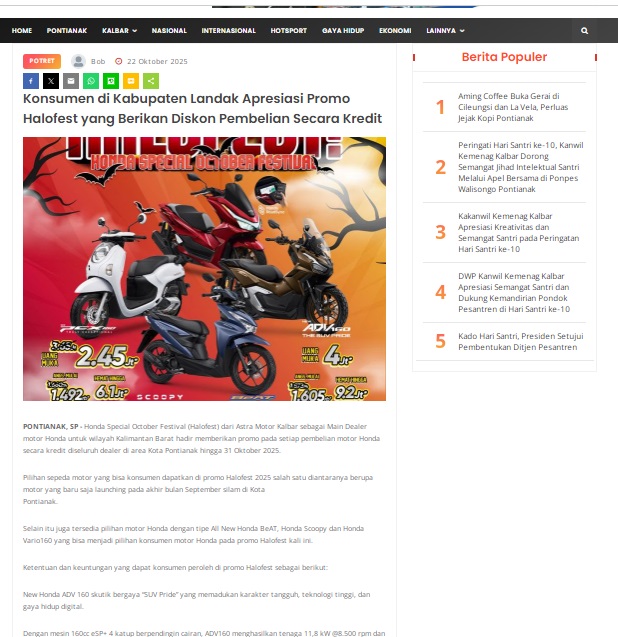 Konsumen di Kabupaten Landak Apresiasi Promo Halofest yang Berikan Diskon Pembelian Secara Kredit by masmul 22 Oktober 2025 in Silahkan kunjungi https://www.suarapemredkalbar.com/read/potret/22102025/konsumen-di-kabupaten-landak-apresiasi-promo-halofest-yang-berikan-diskon-pembelian-secara-kredit. You Might Like Regional Public Launching New ADV160 The SUV Pride Grand Launching New PCX 160 Truly Exceptional! Tetap hati-hati ya bro sist berkendara saat hujan.