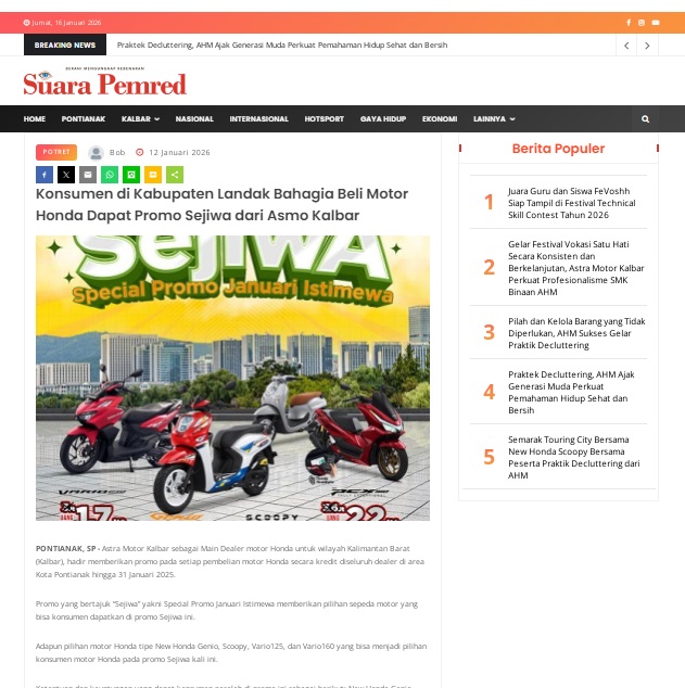 Konsumen di Kabupaten Landak Bahagia Beli Motor Honda Dapat Promo Sejiwa dari Asmo Kalbar by masmul 12 Januari 2026 in Silahkan kunjungi https://www.suarapemredkalbar.com/read/potret/12012026/konsumen-di-kabupaten-landak-bahagia-beli-motor-honda-dapat-promo-sejiwa-dari-asmo-kalbar. You Might Like Regional Public Launching New ADV160 The SUV Pride Grand Launching New PCX 160 Truly Exceptional! Tetap hati-hati ya bro sist berkendara saat hujan.
