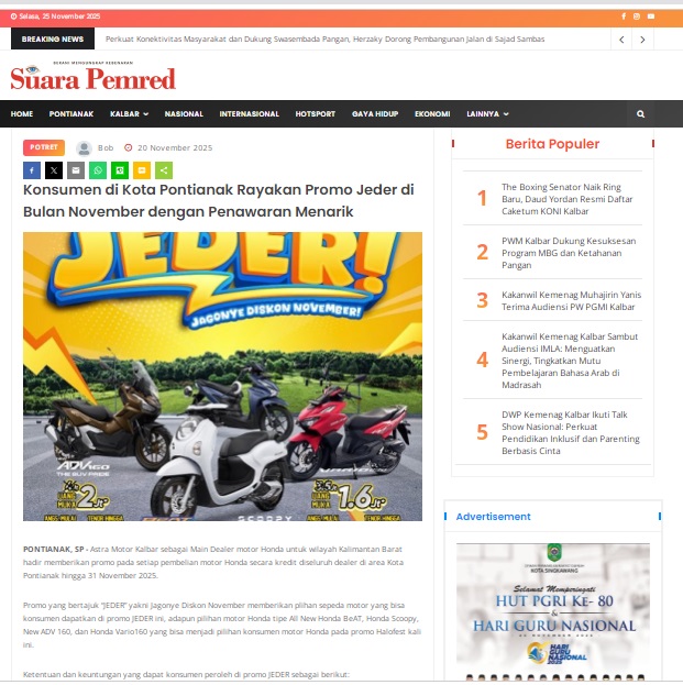 Konsumen di Kota Pontianak Rayakan Promo Jeder di Bulan November dengan Penawaran Menarik by masmul 20 November 2025 in Silahkan kunjungi https://www.suarapemredkalbar.com/read/potret/20112025/konsumen-di-kota-pontianak-rayakan-promo-jeder-di-bulan-november-dengan-penawaran-menarik. You Might Like Regional Public Launching New ADV160 The SUV Pride Grand Launching New PCX 160 Truly Exceptional! Tetap hati-hati ya bro sist berkendara saat hujan.
