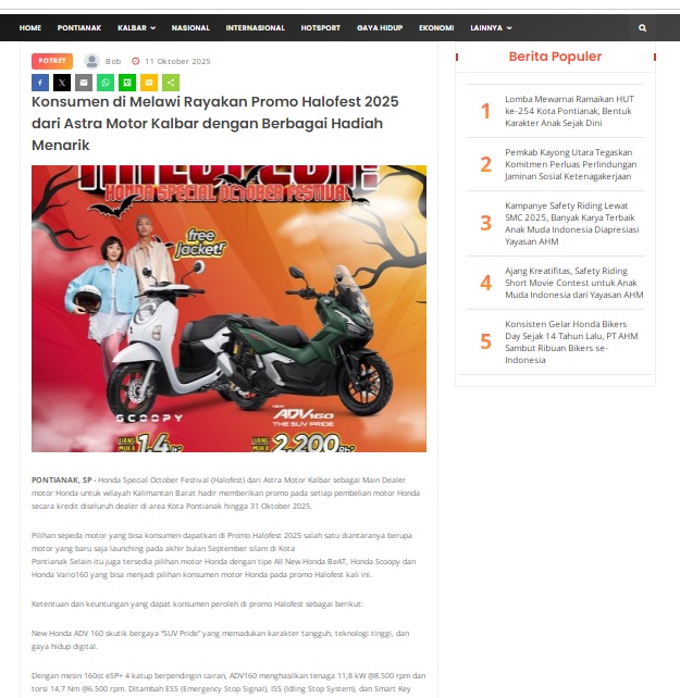 Konsumen di Melawi Rayakan Promo Halofest 2025 dari Astra Motor Kalbar dengan Berbagai Hadiah Menarik by masmul 11 Oktober 2025 in Silahkan kunjungi https://www.suarapemredkalbar.com/read/potret/11102025/konsumen-di-melawi-rayakan-promo-halofest-2025-dari-astra-motor-kalbar-dengan-berbagai-hadiah-menarik. You Might Like Regional Public Launching New ADV160 The SUV Pride Grand Launching New PCX 160 Truly Exceptional! Tetap hati-hati ya bro sist berkendara saat hujan.