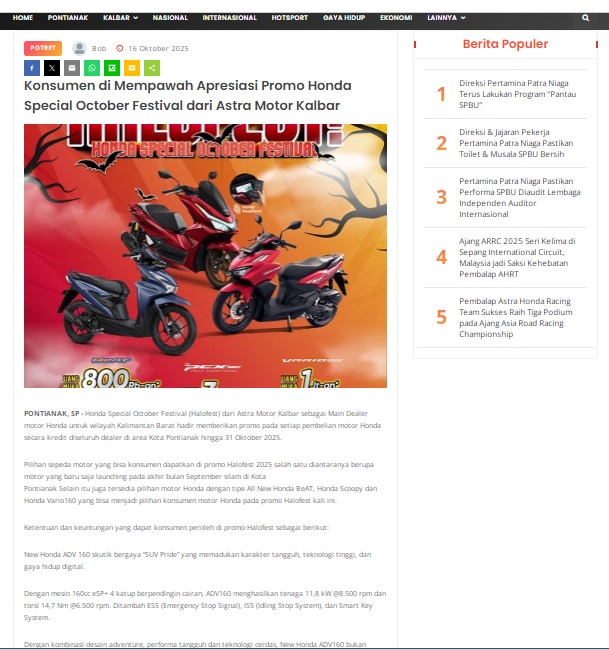 Konsumen di Mempawah Apresiasi Promo Honda Special October Festival dari Astra Motor Kalbar by masmul 16 Oktober 2025 in Silahkan kunjungi https://www.suarapemredkalbar.com/read/potret/16102025/konsumen-di-mempawah-apresiasi-promo-honda-special-october-festival-dari-astra-motor-kalbar. You Might Like Regional Public Launching New ADV160 The SUV Pride Grand Launching New PCX 160 Truly Exceptional! Tetap hati-hati ya bro sist berkendara saat hujan.