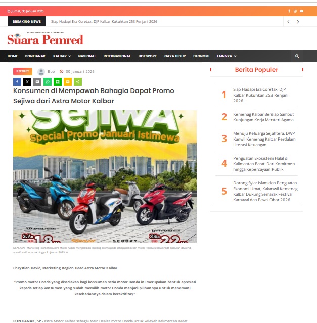 Konsumen di Mempawah Bahagia Dapat Promo Sejiwa dari Astra Motor Kalbar by masmul 30 Januari 2026 in Silahkan kunjungi https://www.suarapemredkalbar.com/read/potret/30012026/konsumen-di-mempawah-bahagia-dapat-promo-sejiwa-dari-astra-motor-kalbar. You Might Like Regional Public Launching New ADV160 The SUV Pride Grand Launching New PCX 160 Truly Exceptional! Tetap hati-hati ya bro sist berkendara saat hujan.