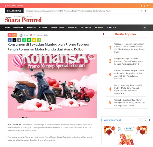 Konsumen di Sekadau Manfaatkan Promo Februari Penuh Romansa Motor Honda dari Asmo Kalbar by masmul 13 Februari 2026 in Silahkan kunjungi https://www.suarapemredkalbar.com/read/potret/13022026/konsumen-di-sekadau-manfaatkan-promo-februari-penuh-romansa-motor-honda-dari-asmo-kalbar. You Might Like Regional Public Launching New ADV160 The SUV Pride Grand Launching New PCX 160 Truly Exceptional! Tetap hati-hati ya bro sist berkendara saat hujan.