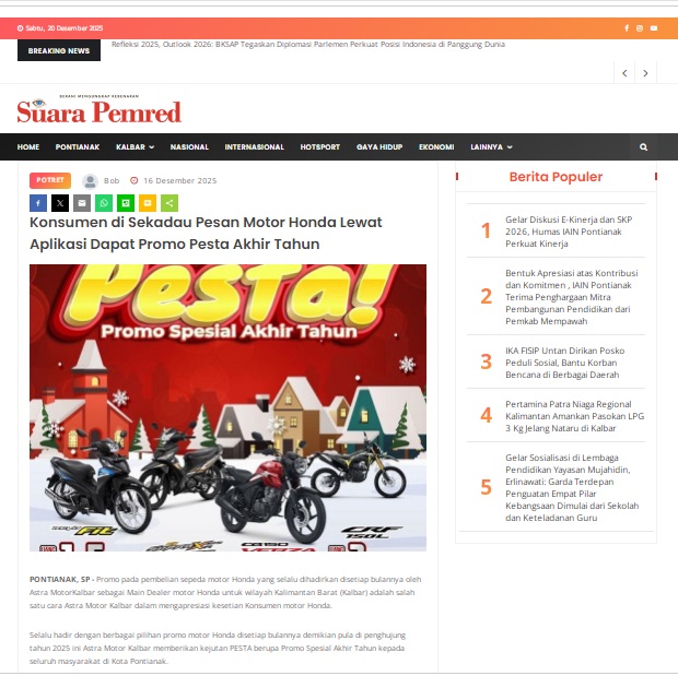Konsumen di Sekadau Pesan Motor Honda Lewat Aplikasi Dapat Promo Pesta Akhir Tahun by masmul 16 Desember 2025 in Silahkan kunjungi https://www.suarapemredkalbar.com/read/potret/16122025/konsumen-di-sekadau-pesan-motor-honda-lewat-aplikasi-dapat-promo-pesta-akhir-tahun. You Might Like Regional Public Launching New ADV160 The SUV Pride Grand Launching New PCX 160 Truly Exceptional! Tetap hati-hati ya bro sist berkendara saat hujan.