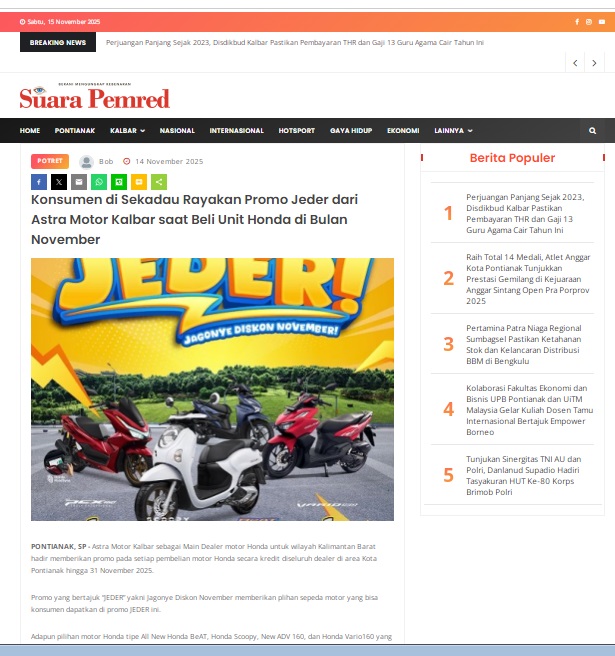 Konsumen di Sekadau Rayakan Promo Jeder dari Astra Motor Kalbar saat Beli Unit Honda di Bulan November by masmul 14 November 2025 in Silahkan kunjungi https://www.suarapemredkalbar.com/read/potret/14112025/konsumen-di-sekadau-rayakan-promo-jeder-dari-astra-motor-kalbar-saat-beli-unit-honda-di-bulan-november. You Might Like Regional Public Launching New ADV160 The SUV Pride Grand Launching New PCX 160 Truly Exceptional! Tetap hati-hati ya bro sist berkendara saat hujan.