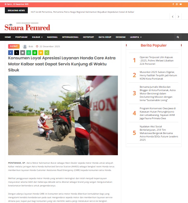 Konsumen Loyal Apresiasi Layanan Honda Care Astra Motor Kalbar saat Dapat Servis Kunjung di Waktu Sibuk by masmul 22 Desember 2025 in Silahkan kunjungi https://www.suarapemredkalbar.com/read/potret/22122025/konsumen-loyal-apresiasi-layanan-honda-care-astra-motor-kalbar-saat-dapat-servis-kunjung-di-waktu-sibuk. You Might Like Regional Public Launching New ADV160 The SUV Pride Grand Launching New PCX 160 Truly Exceptional! Tetap hati-hati ya bro sist berkendara saat hujan.