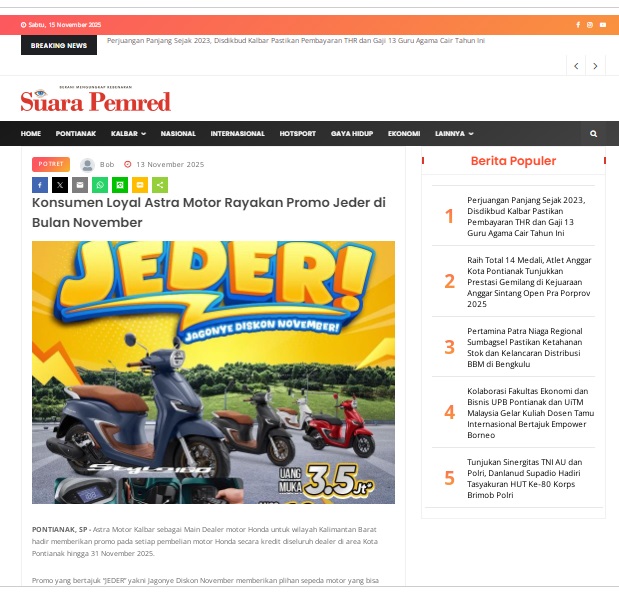 Konsumen Loyal Astra Motor Rayakan Promo Jeder di Bulan November by masmul 13 November 2025 in Silahkan kunjungi https://www.suarapemredkalbar.com/read/potret/13112025/konsumen-loyal-astra-motor-rayakan-promo-jeder-di-bulan-november. You Might Like Regional Public Launching New ADV160 The SUV Pride Grand Launching New PCX 160 Truly Exceptional! Tetap hati-hati ya bro sist berkendara saat hujan.
