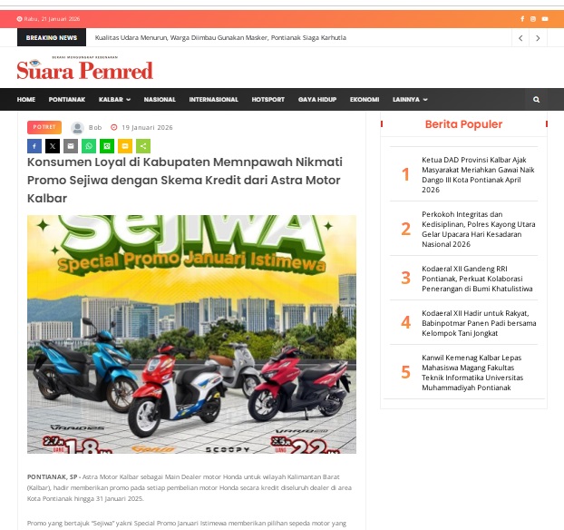 Konsumen Loyal di Kabupaten Memnpawah Nikmati Promo Sejiwa dengan Skema Kredit dari Astra Motor Kalbar by masmul 19 Januari 2026 in Silahkan kunjungi https://www.suarapemredkalbar.com/read/potret/19012026/konsumen-loyal-di-kabupaten-memnpawah-nikmati-promo-sejiwa-dengan-skema-kredit-dari-astra-motor-kalbar. You Might Like Regional Public Launching New ADV160 The SUV Pride Grand Launching New PCX 160 Truly Exceptional! Tetap hati-hati ya bro sist berkendara saat hujan.