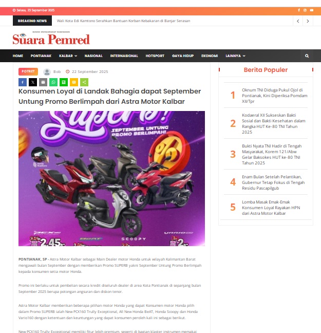 Konsumen Loyal di Landak Bahagia dapat September Untung Promo Berlimpah dari Astra Motor Kalbar by masmul 22 September 2025 in Silahkan kunjungi https://www.suarapemredkalbar.com/read/potret/22092025/konsumen-loyal-di-landak-bahagia-dapat-september-untung-promo-berlimpah-dari-astra-motor-kalbar. You Might Like Regional Public Launching New ADV160 The SUV Pride Grand Launching New PCX 160 Truly Exceptional! Tetap hati-hati ya bro sist berkendara saat hujan.