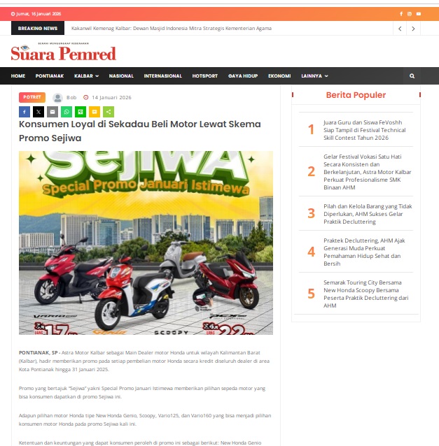 Konsumen Loyal di Sekadau Beli Motor Lewat Skema Promo Sejiwa by masmul 14 Januari 2026 in Silahkan kunjungi https://www.suarapemredkalbar.com/read/potret/14012026/konsumen-loyal-di-sekadau-beli-motor-lewat-skema-promo-sejiwa. You Might Like Regional Public Launching New ADV160 The SUV Pride Grand Launching New PCX 160 Truly Exceptional! Tetap hati-hati ya bro sist berkendara saat hujan.