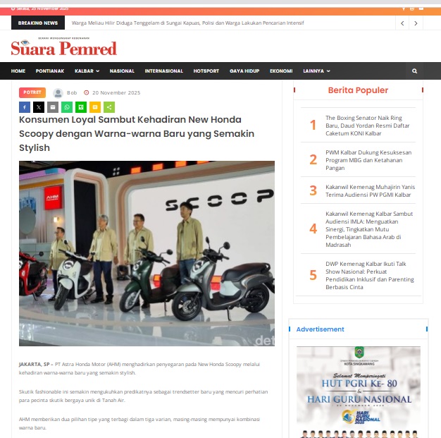 Konsumen Loyal Sambut Kehadiran New Honda Scoopy dengan Warna-warna Baru yang Semakin Stylish by masmul 20 November 2025 in Silahkan kunjungi https://www.suarapemredkalbar.com/read/potret/20112025/konsumen-loyal-sambut-kehadiran-new-honda-scoopy-dengan-warna-warna-baru-yang-semakin-stylish. You Might Like Regional Public Launching New ADV160 The SUV Pride Grand Launching New PCX 160 Truly Exceptional! Tetap hati-hati ya bro sist berkendara saat hujan.