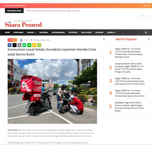 Konsumen Loyal Selalu Gunakan Layanan Honda Care saat Servis Rutin by masmul 3 November 2025 in Silahkan kunjungi https://www.suarapemredkalbar.com/read/potret/03112025/konsumen-loyal-selalu-gunakan-layanan-honda-care-saat-servis-rutin. You Might Like Regional Public Launching New ADV160 The SUV Pride Grand Launching New PCX 160 Truly Exceptional! Tetap hati-hati ya bro sist berkendara saat hujan.