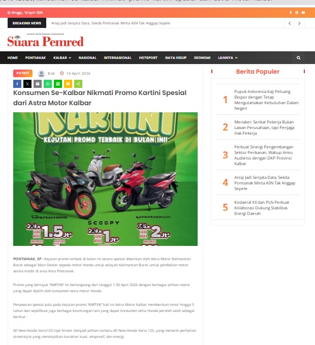 Konsumen Se-Kalbar Nikmati Promo Kartini Spesial dari Astra Motor Kalbar by masmul 14 April 2026 in Silahkan kunjungi https://www.suarapemredkalbar.com/read/potret/14042026/konsumen-se-kalbar-nikmati-promo-kartini-spesial-dari-astra-motor-kalbar. You Might Like Regional Public Launching New ADV160 The SUV Pride Grand Launching New PCX 160 Truly Exceptional! Tetap hati-hati ya bro sist berkendara saat hujan.