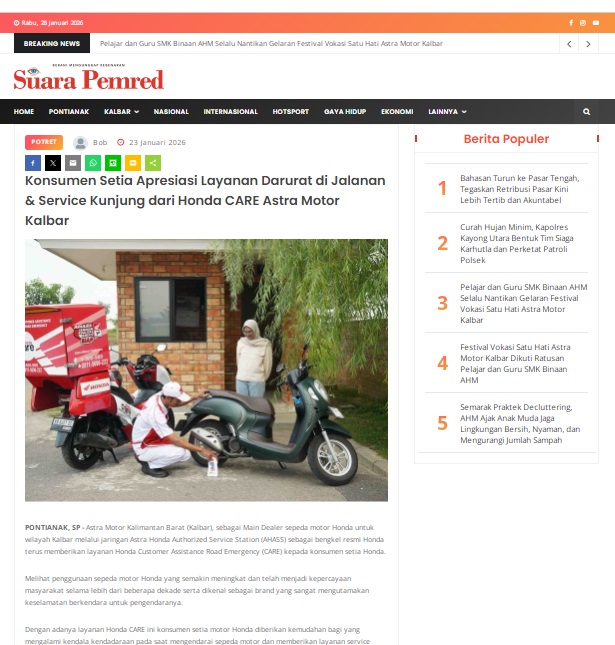 Konsumen Setia Apresiasi Layanan Darurat di Jalanan & Service Kunjung dari Honda CARE Astra Motor Kalbar by masmul 23 Januari 2026 in Silahkan kunjungi https://www.suarapemredkalbar.com/read/potret/23012026/konsumen-setia-apresiasi-layanan-darurat-di-jalanan-service-kunjung-dari-honda-care-astra-motor-kalbar. You Might Like Regional Public Launching New ADV160 The SUV Pride Grand Launching New PCX 160 Truly Exceptional! Tetap hati-hati ya bro sist berkendara saat hujan.