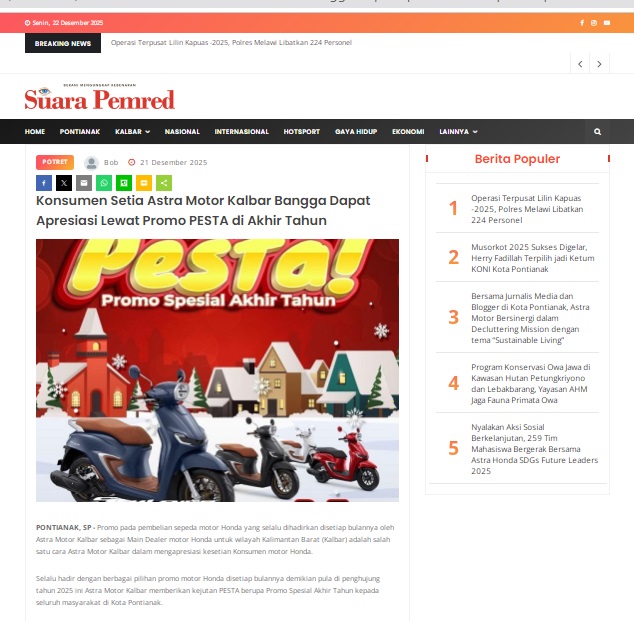 Konsumen Setia Astra Motor Kalbar Bangga Dapat Apresiasi Lewat Promo PESTA di Akhir Tahun by masmul 21 Desember 2025 in Silahkan kunjungi https://www.suarapemredkalbar.com/read/potret/21122025/konsumen-setia-astra-motor-kalbar-bangga-dapat-apresiasi-lewat-promo-pesta-di-akhir-tahun. You Might Like Regional Public Launching New ADV160 The SUV Pride Grand Launching New PCX 160 Truly Exceptional! Tetap hati-hati ya bro sist berkendara saat hujan.