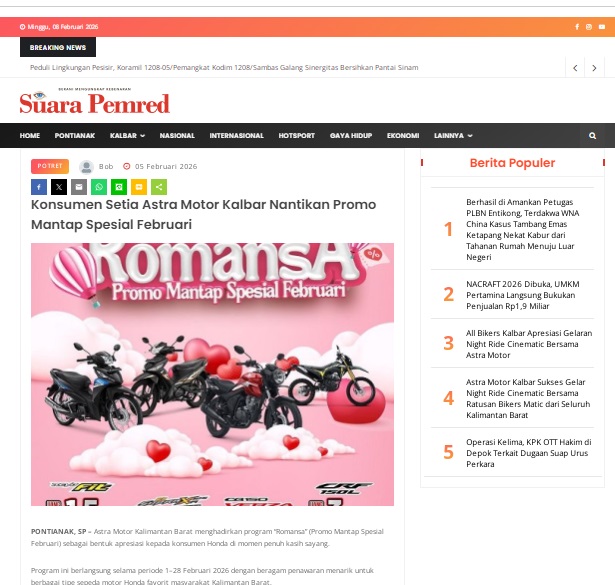 Konsumen Setia Astra Motor Kalbar Nantikan Promo Mantap Spesial Februari by masmul 5 Februari 2026 in Silahkan kunjungi https://www.suarapemredkalbar.com/read/potret/05022026/konsumen-setia-astra-motor-kalbar-nantikan-promo-mantap-spesial-februari. You Might Like Regional Public Launching New ADV160 The SUV Pride Grand Launching New PCX 160 Truly Exceptional! Tetap hati-hati ya bro sist berkendara saat hujan.