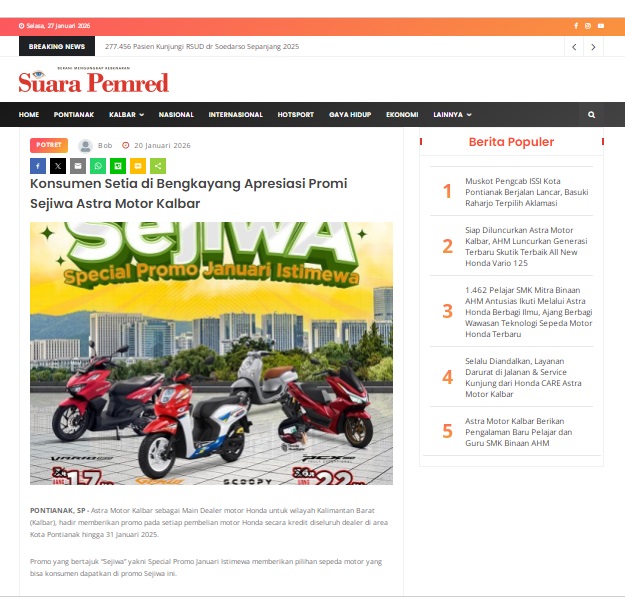 Konsumen Setia di Bengkayang Apresiasi Promi Sejiwa Astra Motor Kalbar by masmul 20 Januari 2026 in Silahkan kunjungi https://www.suarapemredkalbar.com/read/potret/20012026/konsumen-setia-di-bengkayang-apresiasi-promi-sejiwa-astra-motor-kalbar. You Might Like Regional Public Launching New ADV160 The SUV Pride Grand Launching New PCX 160 Truly Exceptional! Tetap hati-hati ya bro sist berkendara saat hujan.