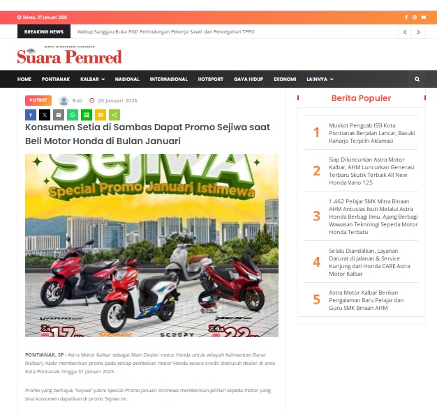 Konsumen Setia di Sambas Dapat Promo Sejiwa saat Beli Motor Honda di Bulan Januari by masmul 20 Januari 2026 in Silahkan kunjungi https://www.suarapemredkalbar.com/read/potret/20012026/konsumen-setia-di-sambas-dapat-promo-sejiwa-saat-beli-motor-honda-di-bulan-januari. You Might Like Regional Public Launching New ADV160 The SUV Pride Grand Launching New PCX 160 Truly Exceptional! Tetap hati-hati ya bro sist berkendara saat hujan.