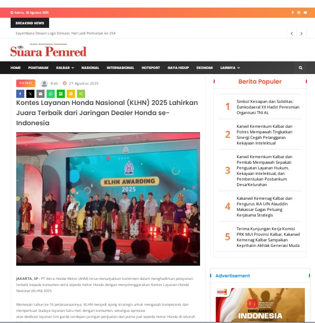Kontes Layanan Honda Nasional (KLHN) 2025 Lahirkan Juara Terbaik dari Jaringan Dealer Honda se-Indonesia by masmul 27 Agustus 2025 in Silahkan kunjungi https://www.suarapemredkalbar.com/read/potret/27082025/kontes-layanan-honda-nasional-klhn-2025-lahirkan-juara-terbaik-dari-jaringan-dealer-honda-se-indonesia. You Might Like Regional Public Launching New ADV160 The SUV Pride Grand Launching New PCX 160 Truly Exceptional! Tetap hati-hati ya bro sist berkendara saat hujan.