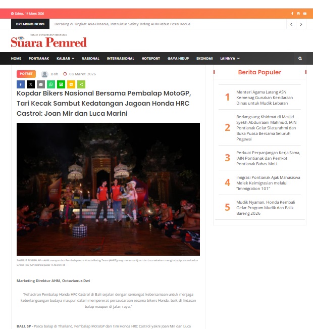 Kopdar Bikers Nasional Bersama Pembalap MotoGP, Tari Kecak Sambut Kedatangan Jagoan Honda HRC Castrol: Joan Mir dan Luca Marini by masmul 8 Maret 2026 in Silahkan kunjungi https://www.suarapemredkalbar.com/read/potret/08032026/kopdar-bikers-nasional-bersama-pembalap-motogp-tari-kecak-sambut-kedatangan-jagoan-honda-hrc-castrol-joan-mir-dan-luca-marini. You Might Like Regional Public Launching New ADV160 The SUV Pride Grand Launching New PCX 160 Truly Exceptional! Tetap hati-hati ya bro sist berkendara saat hujan.