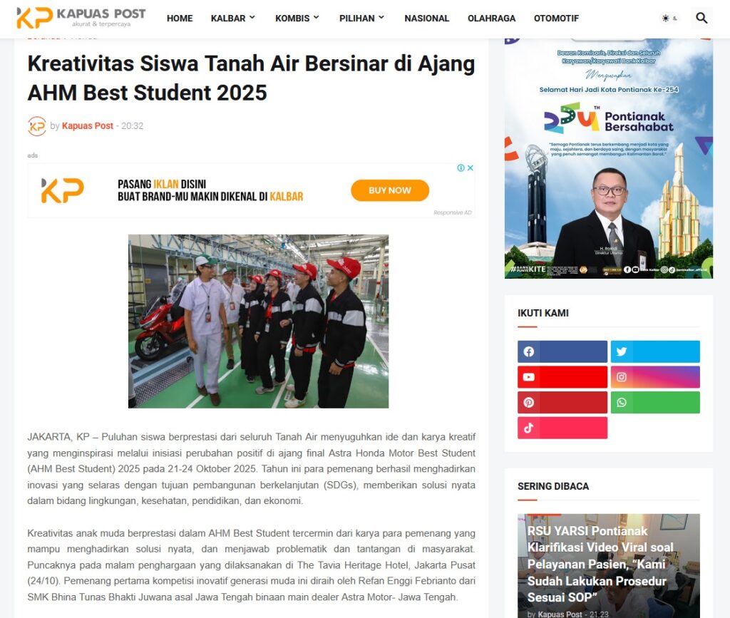 Kreativitas Siswa Tanah Air Bersinar di Ajang AHM Best Student 2025 by Muhammad Arif 12 November 2025 in Silahkan kunjungi https://www.kapuaspost.web.id/2025/11/kreativitas-siswa-tanah-air-bersinar-di.html. Tags: astra Astra Motor kalbar Astra Motor Pontianak astramotor honda kalbar pontianak sepeda motor You Might Like Regional Public Launching New ADV160 The SUV Pride Grand Launching New PCX 160 Truly Exceptional! Tetap hati-hati ya bro sist berkendara saat hujan.