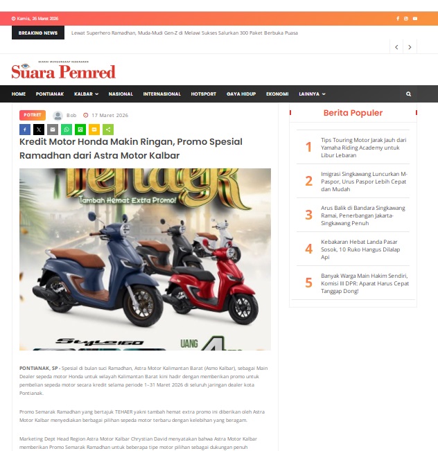 Kredit Motor Honda Makin Ringan, Promo Spesial Ramadhan dari Astra Motor Kalbar by masmul 17 Maret 2026 in Silahkan kunjungi https://www.suarapemredkalbar.com/read/potret/17032026/kredit-motor-honda-makin-ringan-promo-spesial-ramadhan-dari-astra-motor-kalbar. You Might Like Regional Public Launching New ADV160 The SUV Pride Grand Launching New PCX 160 Truly Exceptional! Tetap hati-hati ya bro sist berkendara saat hujan.