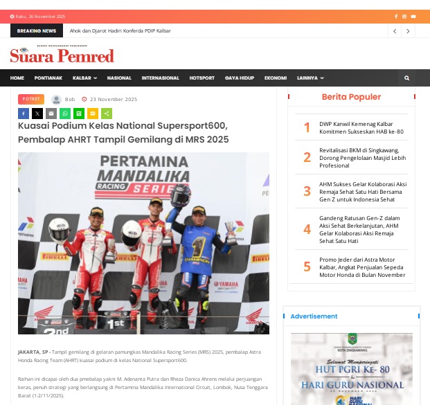Kuasai Podium Kelas National Supersport600, Pembalap AHRT Tampil Gemilang di MRS 2025 by masmul 23 November 2025 in Silahkan kunjungi https://www.suarapemredkalbar.com/read/potret/23112025/kuasai-podium-kelas-national-supersport600-pembalap-ahrt-tampil-gemilang-di-mrs-2025. You Might Like Regional Public Launching New ADV160 The SUV Pride Grand Launching New PCX 160 Truly Exceptional! Tetap hati-hati ya bro sist berkendara saat hujan.