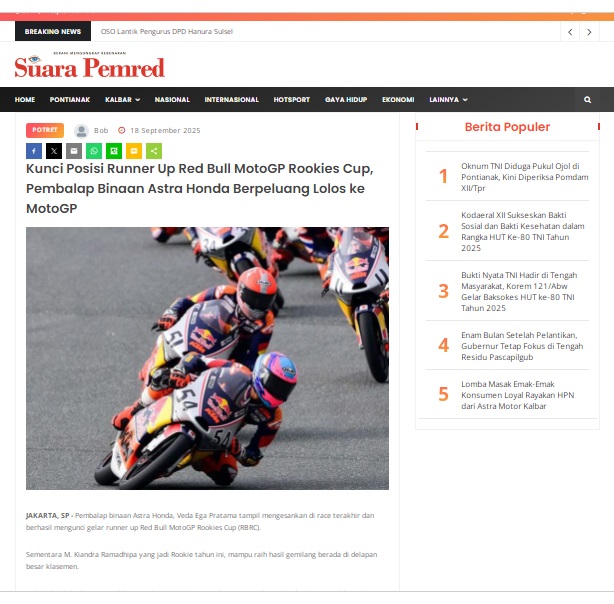 Kunci Posisi Runner Up Red Bull MotoGP Rookies Cup, Pembalap Binaan Astra Honda Berpeluang Lolos ke MotoGP by masmul 18 September 2025 in Silahkan kunjungi https://www.suarapemredkalbar.com/read/potret/18092025/kunci-posisi-runner-up-red-bull-motogp-rookies-cup-pembalap-binaan-astra-honda-berpeluang-lolos-ke-motogp. You Might Like Regional Public Launching New ADV160 The SUV Pride Grand Launching New PCX 160 Truly Exceptional! Tetap hati-hati ya bro sist berkendara saat hujan.