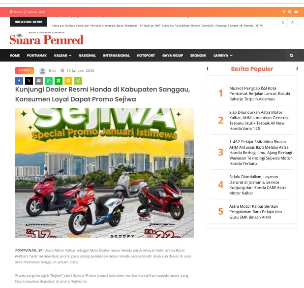 Kunjungi Dealer Resmi Honda di Kabupaten Sanggau, Konsumen Loyal Dapat Promo Sejiwa by masmul 20 Januari 2026 in Silahkan kunjungi https://www.suarapemredkalbar.com/read/potret/20012026/kunjungi-dealer-resmi-honda-di-kabupaten-sanggau-konsumen-loyal-dapat-promo-sejiwa. You Might Like Regional Public Launching New ADV160 The SUV Pride Grand Launching New PCX 160 Truly Exceptional! Tetap hati-hati ya bro sist berkendara saat hujan.