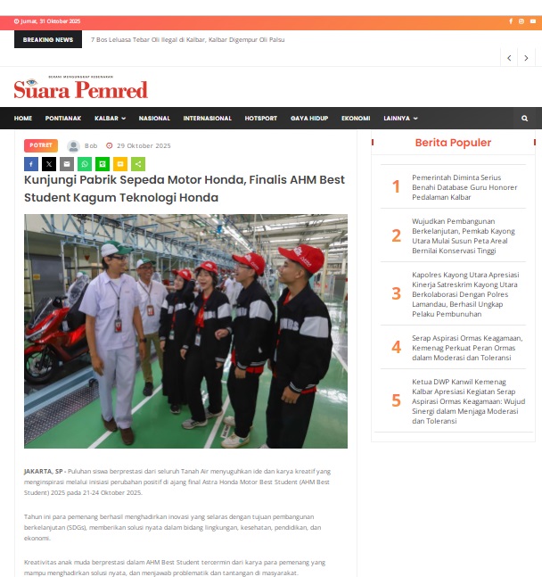 Kunjungi Pabrik Sepeda Motor Honda, Finalis AHM Best Student Kagum Teknologi Honda by masmul 29 Oktober 2025 in Silahkan kunjungi https://www.suarapemredkalbar.com/read/potret/29102025/kunjungi-pabrik-sepeda-motor-honda-finalis-ahm-best-student-kagum-teknologi-honda. You Might Like Regional Public Launching New ADV160 The SUV Pride Grand Launching New PCX 160 Truly Exceptional! Tetap hati-hati ya bro sist berkendara saat hujan.