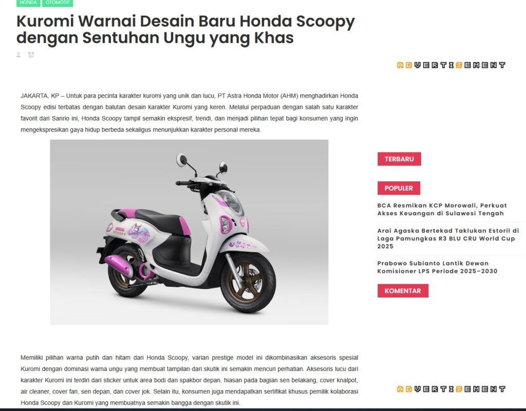 Kuromi Warnai Desain Baru Honda Scoopy dengan Sentuhan Ungu yang Khas by Muhammad Arif 13 Oktober 2025 in Silahkan kunjungi https://www.kapuaspost.web.id/2025/10/kuromi-warnai-desain-baru-honda-scoopy.html. Tags: astra Astra Motor kalbar Astra Motor Pontianak astramotor honda kalbar pontianak sepeda motor You Might Like Regional Public Launching New ADV160 The SUV Pride Grand Launching New PCX 160 Truly Exceptional! Tetap hati-hati ya bro sist berkendara saat hujan.