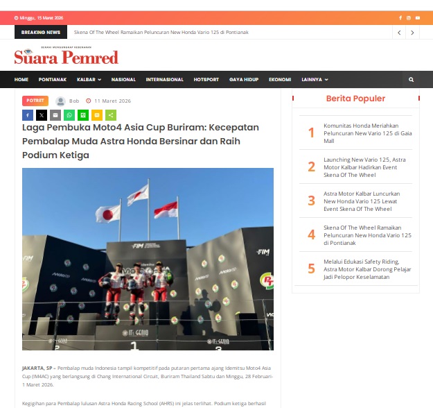Laga Pembuka Moto4 Asia Cup Buriram: Kecepatan Pembalap Muda Astra Honda Bersinar dan Raih Podium Ketiga by masmul 11 Maret 2026 in Silahkan kunjungi https://www.suarapemredkalbar.com/read/potret/11032026/laga-pembuka-moto4-asia-cup-buriram-kecepatan-pembalap-muda-astra-honda-bersinar-dan-raih-podium-ketiga. You Might Like Regional Public Launching New ADV160 The SUV Pride Grand Launching New PCX 160 Truly Exceptional! Tetap hati-hati ya bro sist berkendara saat hujan.