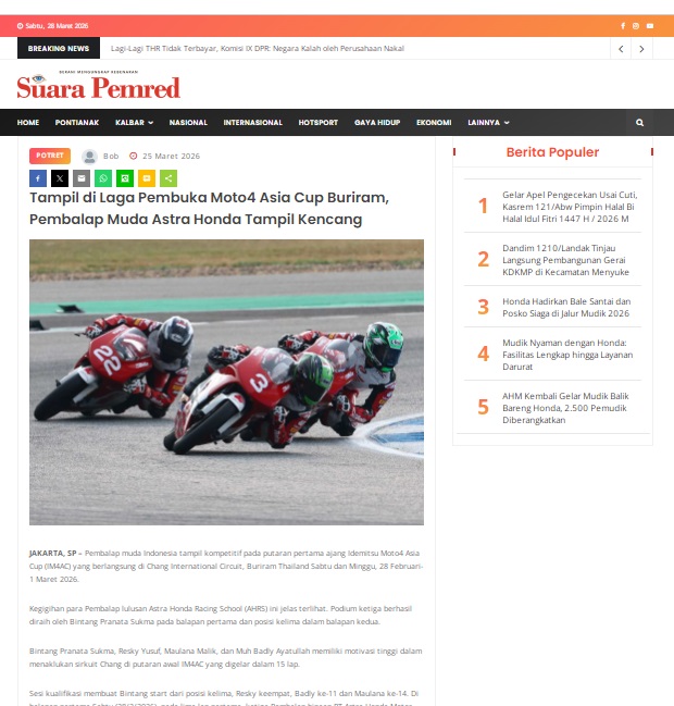 Laga Pembuka Moto4 Asia Cup Tampil di Laga Pembuka Moto4 Asia Cup Buriram, Pembalap Muda Astra Honda Tampil KencangBuriram di Thailand, Ini Laju Pembalap Muda Astra Honda dan Rebut Podium Kedua by masmul 25 Maret 2026 in Silahkan kunjungi https://www.suarapemredkalbar.com/read/potret/25032026/tampil-di-laga-pembuka-moto4-asia-cup-buriram-pembalap-muda-astra-honda-tampil-kencang. You Might Like Regional Public Launching New ADV160 The SUV Pride Grand Launching New PCX 160 Truly Exceptional! Tetap hati-hati ya bro sist berkendara saat hujan.