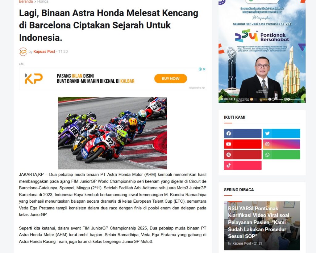 Lagi, Binaan Astra Honda Melesat Kencang di Barcelona Ciptakan Sejarah Untuk Indonesia. by Muhammad Arif 5 November 2025 in Silahkan kunjungi https://www.kapuaspost.web.id/2025/11/lagi-binaan-astra-honda-melesat-kencang.html. Tags: astra Astra Motor kalbar Astra Motor Pontianak astramotor honda kalbar pontianak sepeda motor You Might Like Regional Public Launching New ADV160 The SUV Pride Grand Launching New PCX 160 Truly Exceptional! Tetap hati-hati ya bro sist berkendara saat hujan.