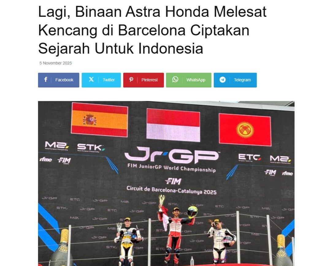 Lagi, Binaan Astra Honda Melesat Kencang di Barcelona Ciptakan Sejarah Untuk Indonesia by Nova Sari 5 November 2025 in Silahkan kunjungi https://equator.co.id/lagi-binaan-astra-honda-melesat-kencang-di-barcelona-ciptakan-sejarah-untuk-indonesia/. You Might Like Regional Public Launching New ADV160 The SUV Pride Grand Launching New PCX 160 Truly Exceptional! Tetap hati-hati ya bro sist berkendara saat hujan.