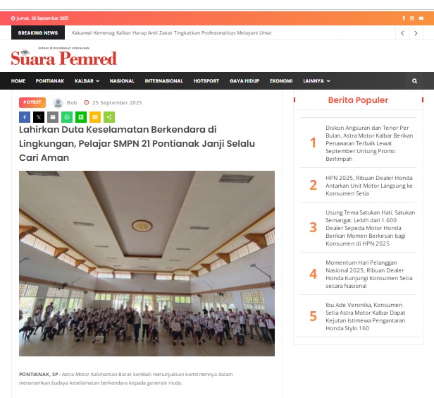 Lahirkan Duta Keselamatan Berkendara di Lingkungan, Pelajar SMPN 21 Pontianak Janji Selalu Cari Aman by masmul 25 September 2025 in Silahkan kunjungi https://www.suarapemredkalbar.com/read/potret/25092025/lahirkan-duta-keselamatan-berkendara-di-lingkungan-pelajar-smpn-21-pontianak-janji-selalu-cari-aman. You Might Like Regional Public Launching New ADV160 The SUV Pride Grand Launching New PCX 160 Truly Exceptional! Tetap hati-hati ya bro sist berkendara saat hujan.