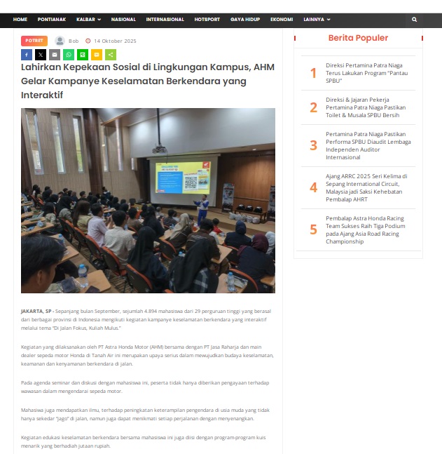 Lahirkan Kepekaan Sosial di Lingkungan Kampus, AHM Gelar Kampanye Keselamatan Berkendara yang Interaktif by masmul 14 Oktober 2025 in Silahkan kunjungi https://www.suarapemredkalbar.com/read/potret/14102025/lahirkan-kepekaan-sosial-di-lingkungan-kampus-ahm-gelar-kampanye-keselamatan-berkendara-yang-interaktif. You Might Like Regional Public Launching New ADV160 The SUV Pride Grand Launching New PCX 160 Truly Exceptional! Tetap hati-hati ya bro sist berkendara saat hujan.