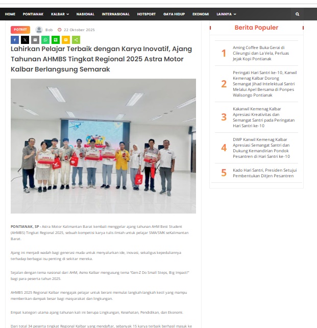 Lahirkan Pelajar Terbaik dengan Karya Inovatif, Ajang Tahunan AHMBS Tingkat Regional 2025 Astra Motor Kalbar Berlangsung Semarak by masmul 22 Oktober 2025 in Silahkan kunjungi https://www.suarapemredkalbar.com/read/potret/22102025/lahirkan-pelajar-terbaik-dengan-karya-inovatif-ajang-tahunan-ahmbs-tingkat-regional-2025-astra-motor-kalbar-berlangsung-semarak. You Might Like Regional Public Launching New ADV160 The SUV Pride Grand Launching New PCX 160 Truly Exceptional! Tetap hati-hati ya bro sist berkendara saat hujan.