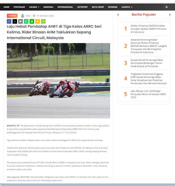 Laju Hebat Pembalap AHRT di Tiga Kelas ARRC Seri Kelima, Rider Binaan AHM Taklukkan Sepang International Circuit, Malaysia by masmul 19 Oktober 2025 in Silahkan kunjungi https://www.suarapemredkalbar.com/read/potret/19102025/laju-hebat-pembalap-ahrt-di-tiga-kelas-arrc-seri-kelima-rider-binaan-ahm-taklukkan-sepang-international-circuit-malaysia. You Might Like Regional Public Launching New ADV160 The SUV Pride Grand Launching New PCX 160 Truly Exceptional! Tetap hati-hati ya bro sist berkendara saat hujan.