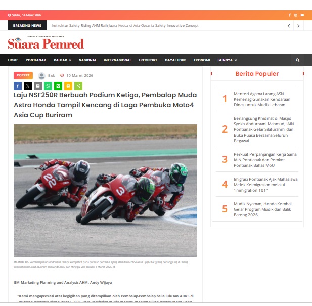 Laju NSF250R Berbuah Podium Ketiga, Pembalap Muda Astra Honda Tampil Kencang di Laga Pembuka Moto4 Asia Cup Buriram by masmul 10 Maret 2026 in Silahkan kunjungi https://www.suarapemredkalbar.com/read/potret/10032026/laju-nsf250r-berbuah-podium-ketiga-pembalap-muda-astra-honda-tampil-kencang-di-laga-pembuka-moto4-asia-cup-buriram. You Might Like Regional Public Launching New ADV160 The SUV Pride Grand Launching New PCX 160 Truly Exceptional! Tetap hati-hati ya bro sist berkendara saat hujan.