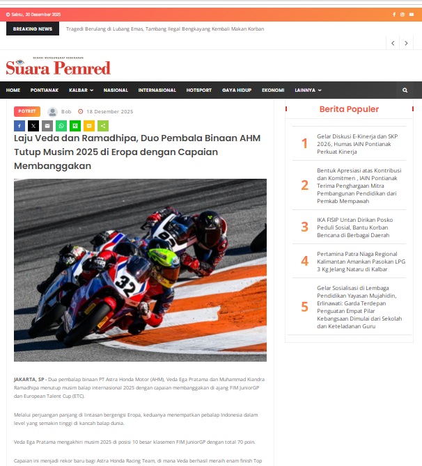 Laju Veda dan Ramadhipa, Duo Pembala Binaan AHM Tutup Musim 2025 di Eropa dengan Capaian Membanggakan by masmul 18 Desember 2025 in Silahkan kunjungi https://www.suarapemredkalbar.com/read/potret/18122025/laju-veda-dan-ramadhipa-duo-pembala-binaan-ahm-tutup-musim-2025-di-eropa-dengan-capaian-membanggakan. You Might Like Regional Public Launching New ADV160 The SUV Pride Grand Launching New PCX 160 Truly Exceptional! Tetap hati-hati ya bro sist berkendara saat hujan.