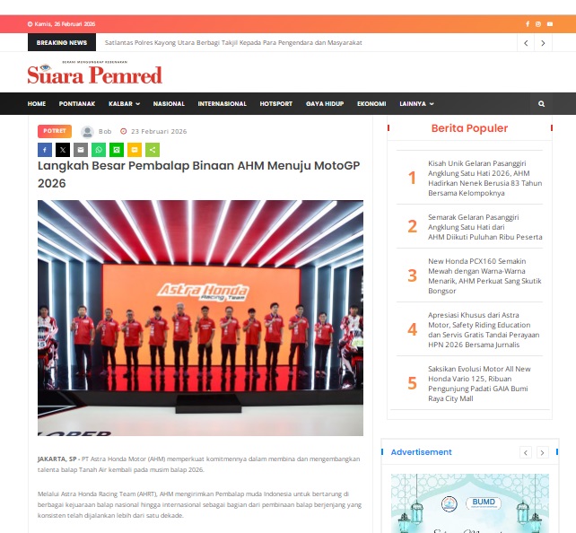 Langkah Besar Pembalap Binaan AHM Menuju MotoGP 2026 by masmul 23 Februari 2026 in Silahkan kunjungi https://www.suarapemredkalbar.com/read/potret/23022026/langkah-besar-pembalap-binaan-ahm-menuju-motogp-2026. You Might Like Regional Public Launching New ADV160 The SUV Pride Grand Launching New PCX 160 Truly Exceptional! Tetap hati-hati ya bro sist berkendara saat hujan.
