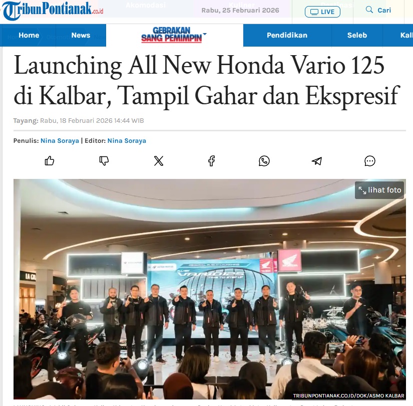 Launching All New Honda Vario 125 di Kalbar, Tampil Gahar dan Ekspresif by Nina Soraya 18 Februari 2026 in Silahkan kunjungi https://pontianak.tribunnews.com/otomotif/1162650/launching-all-new-honda-vario-125-di-kalbar-tampil-gahar-dan-ekspresif. You Might Like Regional Public Launching New ADV160 The SUV Pride Grand Launching New PCX 160 Truly Exceptional! Tetap hati-hati ya bro sist berkendara saat hujan.