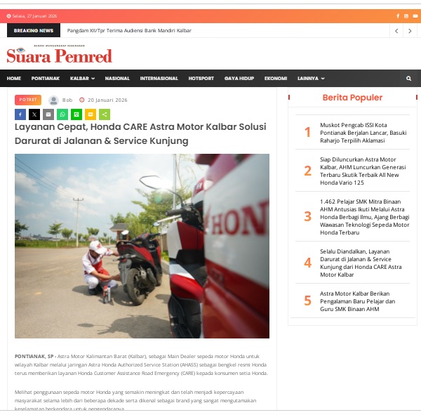 Layanan Cepat, Honda CARE Astra Motor Kalbar Solusi Darurat di Jalanan & Service Kunjung by masmul 20 Januari 2026 in Silahkan kunjungi https://www.suarapemredkalbar.com/read/potret/20012026/layanan-cepat-honda-care-astra-motor-kalbar-solusi-darurat-di-jalanan-service-kunjung. You Might Like Regional Public Launching New ADV160 The SUV Pride Grand Launching New PCX 160 Truly Exceptional! Tetap hati-hati ya bro sist berkendara saat hujan.