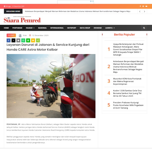 Layanan Darurat di Jalanan & Service Kunjung dari Honda CARE Astra Motor Kalbar by masmul 12 Desember 2025 in Silahkan kunjungi https://www.suarapemredkalbar.com/read/potret/12122025/layanan-darurat-di-jalanan-service-kunjung-dari-honda-care-astra-motor-kalbar. You Might Like Regional Public Launching New ADV160 The SUV Pride Grand Launching New PCX 160 Truly Exceptional! Tetap hati-hati ya bro sist berkendara saat hujan.