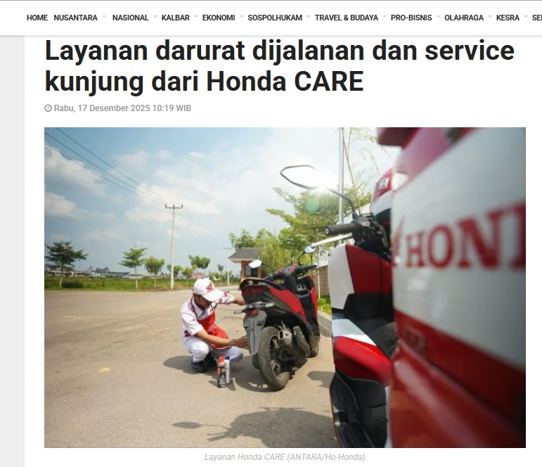 Layanan darurat dijalanan dan service kunjung dari Honda CARE by Dedi 17 Desember 2025 in Silahkan kunjungi https://kalbar.antaranews.com/berita/678355/layanan-darurat-dijalanan-dan-service-kunjung-dari-honda-care. You Might Like Regional Public Launching New ADV160 The SUV Pride Grand Launching New PCX 160 Truly Exceptional! Tetap hati-hati ya bro sist berkendara saat hujan.